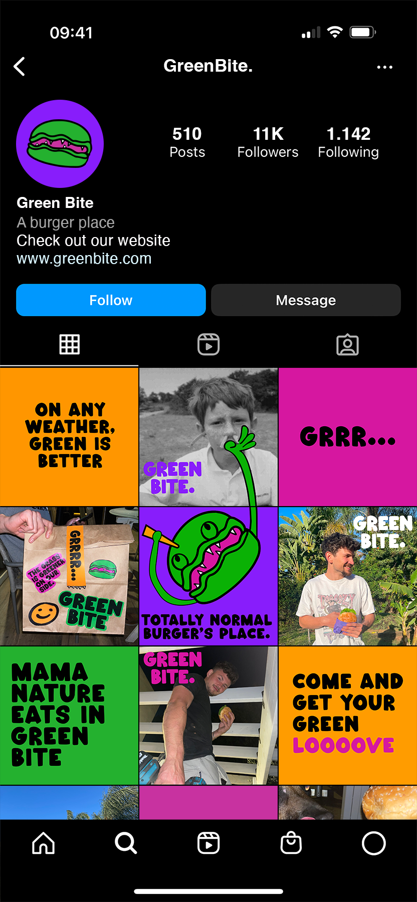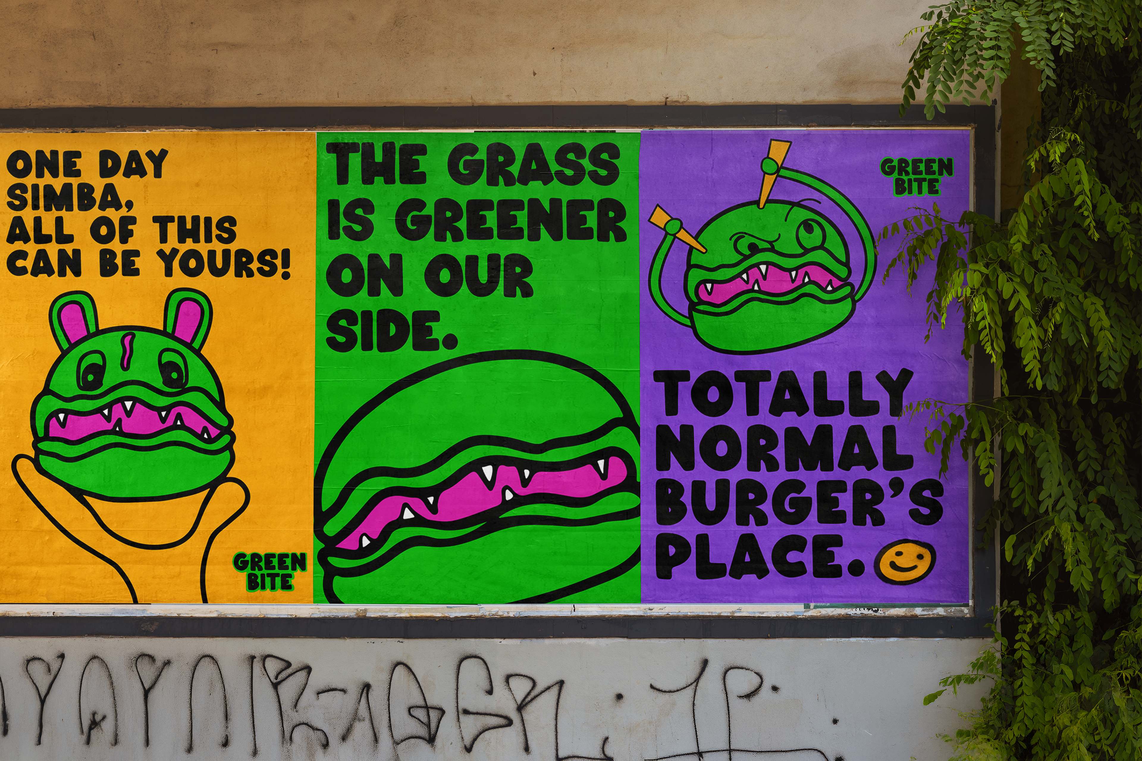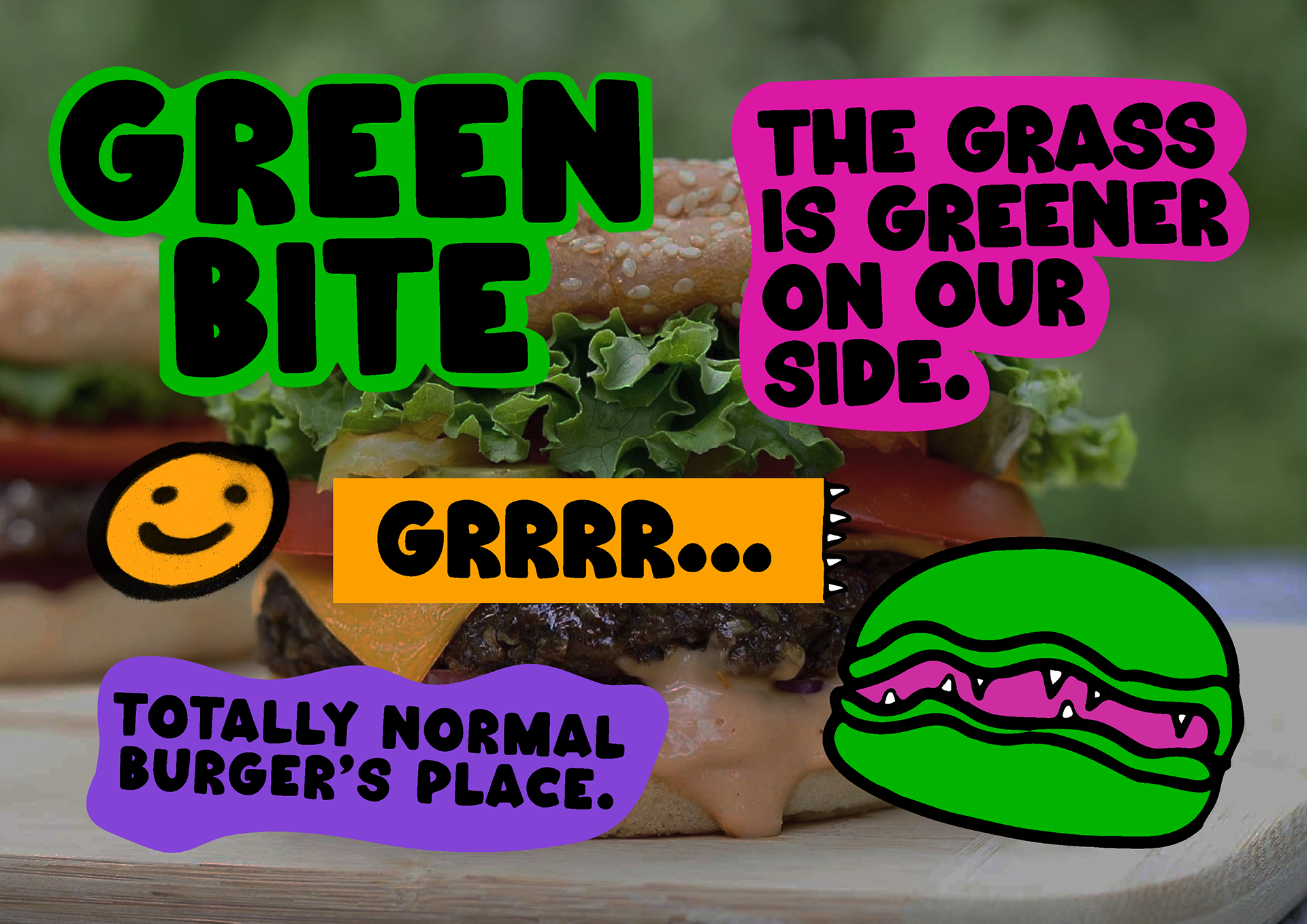 Project Type Branding 2024 Green Bite is a vegan burger's place that celebrates the craving for junk food, a place where vegans can enjoy a decadent meal at any hour without feeling the need to apologize or feel obligated to eat healthy because they are vegan.