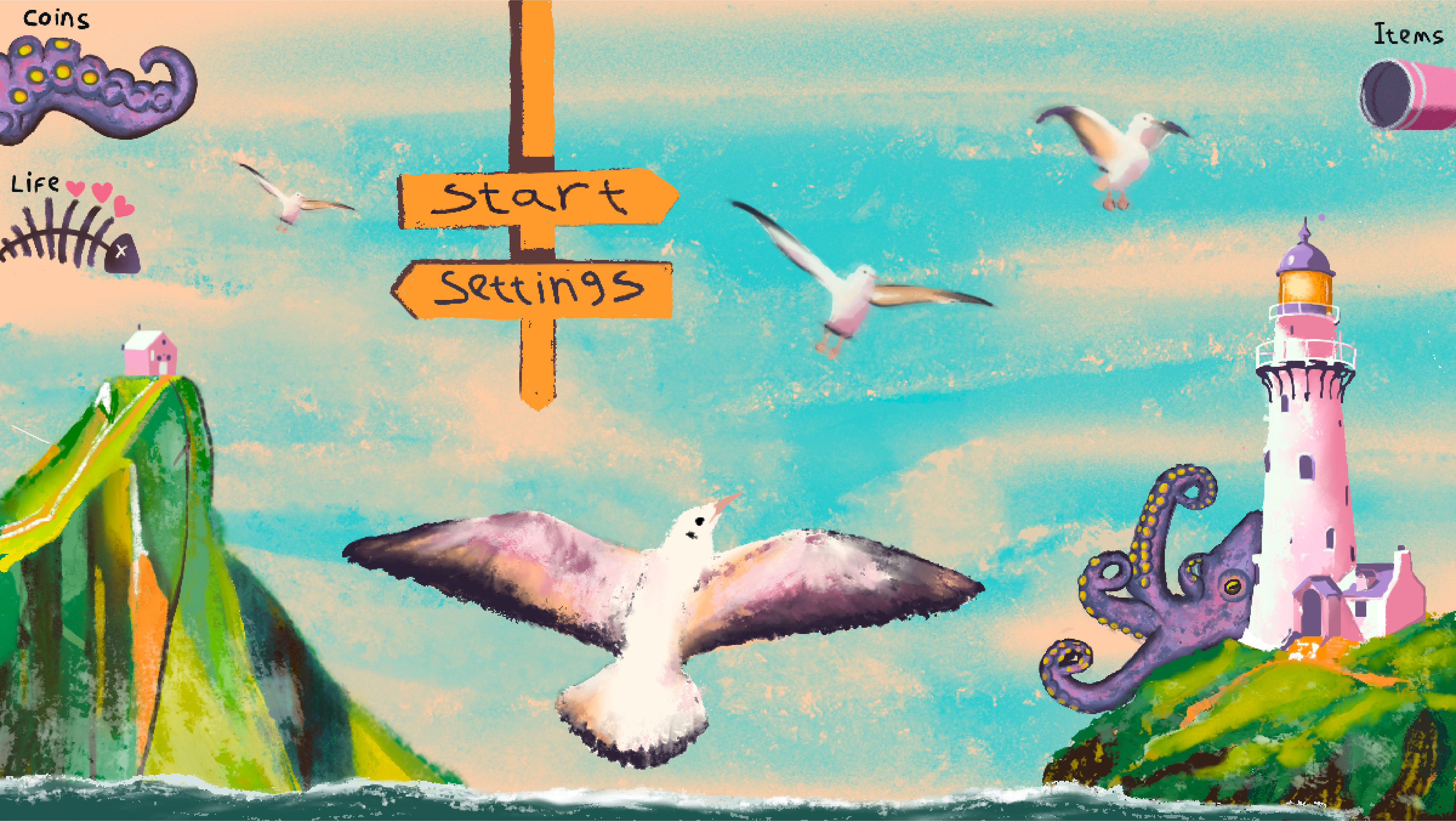 Project Type Illustration & concept design 2025 Design and illustration of screens for a computer game called "The Lighthouse" - a game of rivalry between two enemies: the seagull and the octopus. The two fight for control of the lighthouse, the octopus's advantage is its size and its long, flexible arms, but the seagull does not give up easily and finds objects in the sea that help him fight the evil octopus.